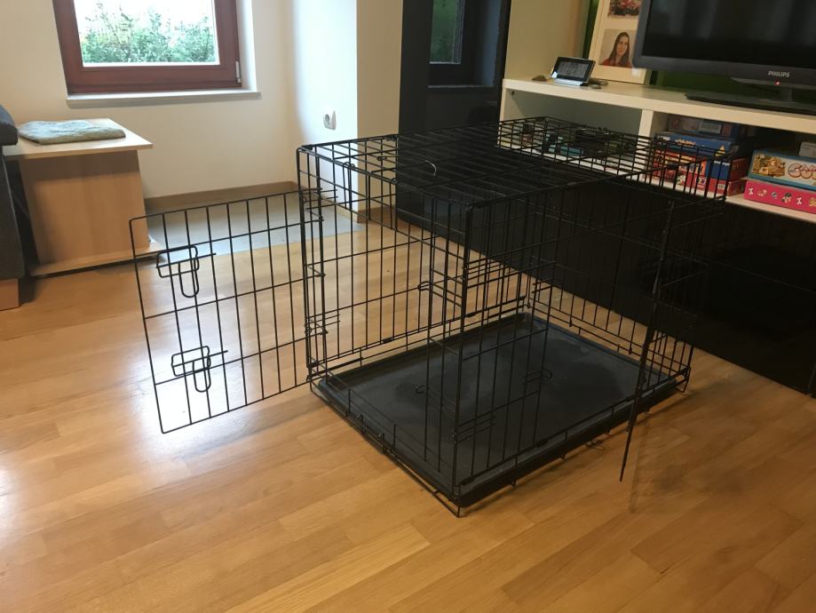 Prodam zelo dobro ohranjeno kletko za psa z merami š=76cm, v=60 cm, g=55cm. Kletka ima dvoje vrat, je enostavna za postavitev, črne barve.