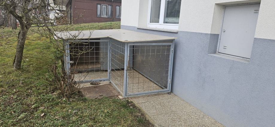 Kletka je primerna za manjšega do srednje velikega psa. Narejena je iz kovinskih profilov in mreže, znotraj nje je lesena hiška z dvojno steno s sobico in predprostorom.