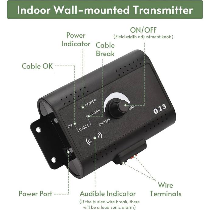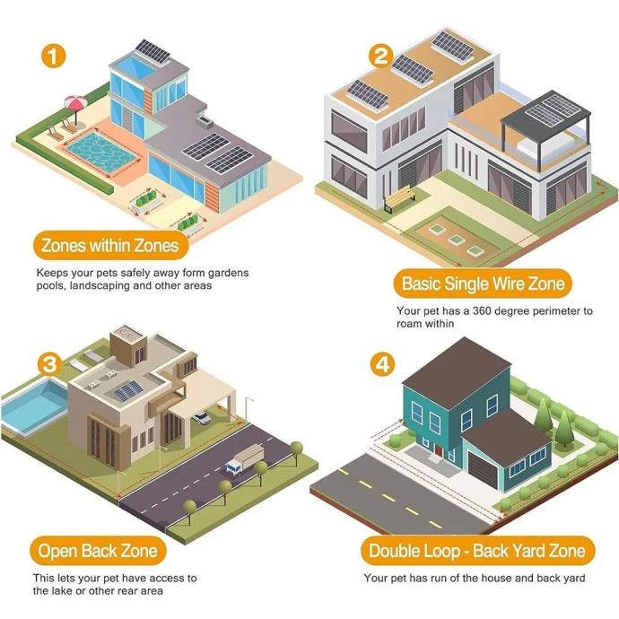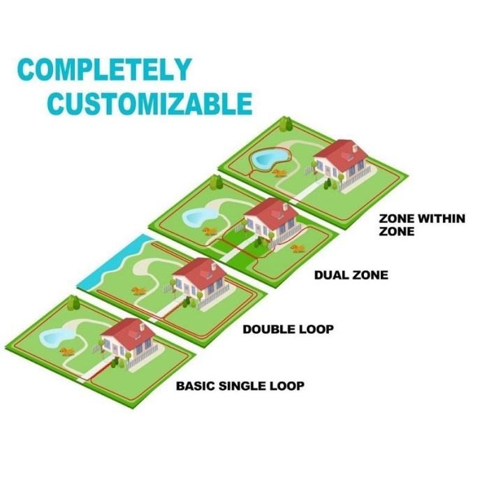 Nevidna ograja bo razmejila vaše ozemlje za prosto gibanje v 4 cone.Sprejemnik je vodoodporen in ga je mogoče polniti ( rechargable )