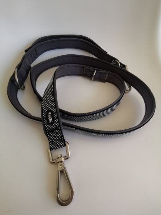 Povodec ima na spodnjem delu pri karabinu dodatno zanko, katero lahko uporabljamo kot ročaj in tako skrajšamo povodec za varno hojo poleg.