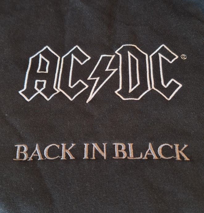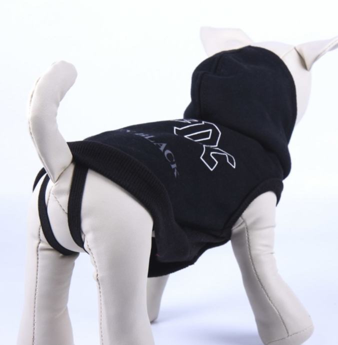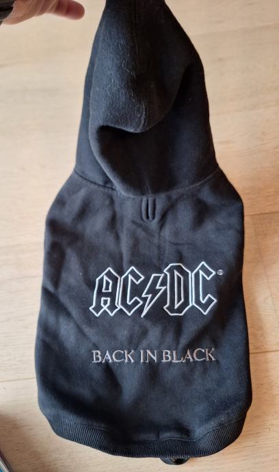 Prodam skoraj novo rahlo elastično oblačilo za psa - pulover s kapuco velikosti M z AC-DC napisom na hrbtu.