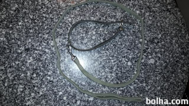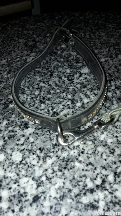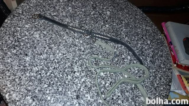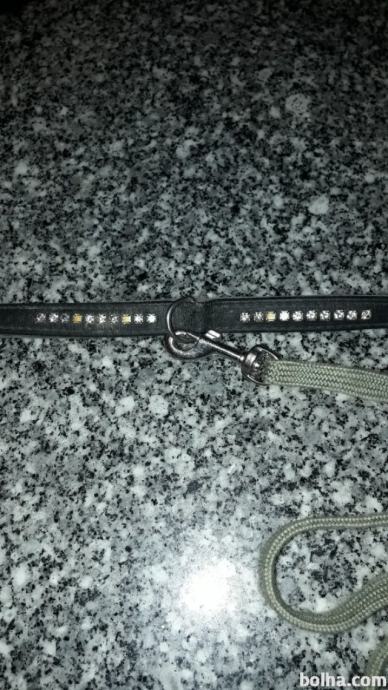 Povodec je iz močne zelene vrvi,ovratnica je iz črnega usnja z srebrnimi kamenčki,dva kamenčka manjkata.Ovratnica meri 44,3cm,povodec pa 115cm.Tel.064 222 880,poštnina po povzetju.