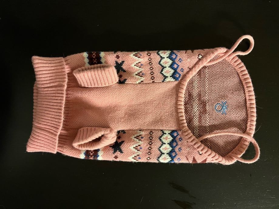 Prodajam skoraj nenošen roza pulover za kužke primeren za psičke do 10kg. Pulover je bil kupljen lani, ampak ga zaradi neprimerne velikosti nismo uporabljali. Na hrbtu ima tudi odprtino za povodec, da se lahko kužka pripne na oprsnico. Gre za izdelek znamke United colours of benetton izdelane iz žakard pletenine. Primeren za hladne zimske dni.