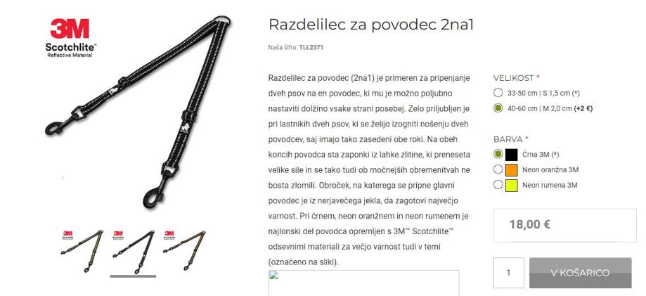 Razdelilec za povodec (2na1) je primeren za pripenjanje dveh psov na en povodec, ki mu je možno poljubno nastaviti dolžino vsake strani posebej. Zelo priljubljen je pri lastnikih dveh psov, ki se želijo izogniti nošenju dveh povodcev, saj imajo tako zasedeni obe roki. Na obeh koncih povodca sta zaponki iz lahke zlitine, ki preneseta velike sile in se tako tudi ob močnejših obremenitvah ne bosta zlomili. Obroček, na katerega se pripne glavni povodec je iz nerjavečega jekla, da zagotovi največjo varnost. Pri črnem, neon oranžnem in neon rumenem je najlonski del povodca opremljen s 3M™ Scotchlite™ odsevnimi materiali za večjo varnost tudi v temi