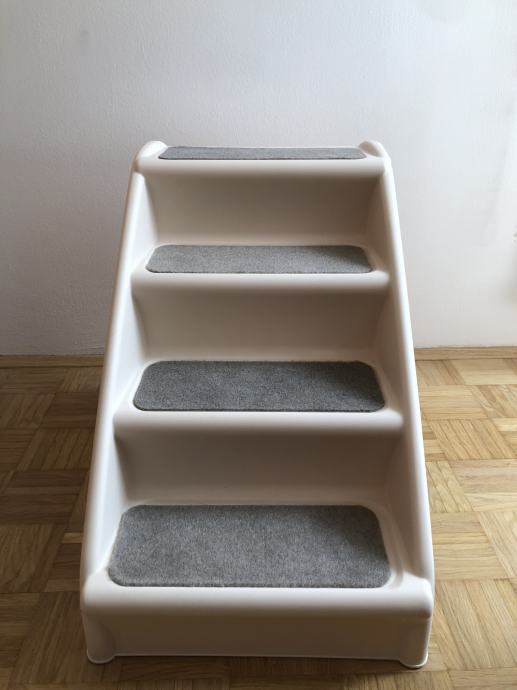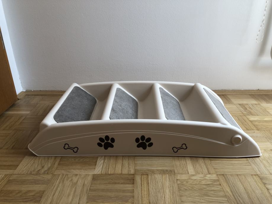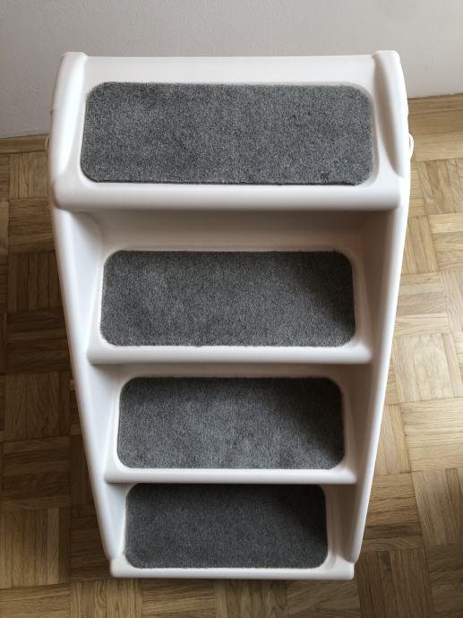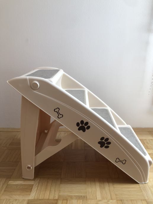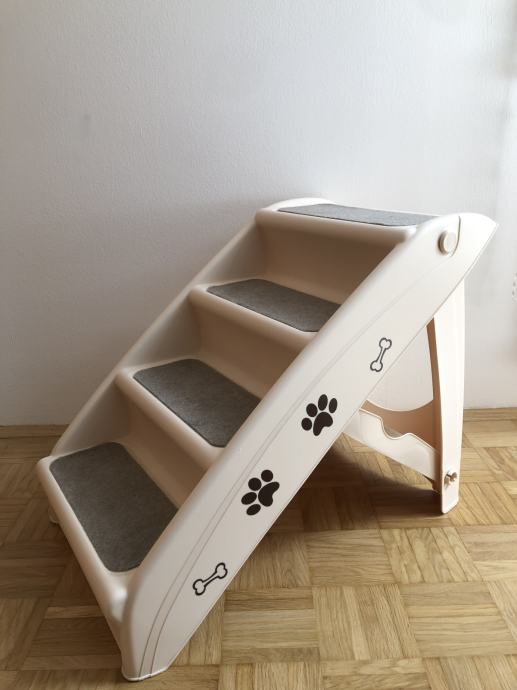 Lestev za hišne ljubljenčke lahko zložite in shranite pod pohištvo, ko ni v uporabi. Je enostavno za zlaganje in je vse v enem kosu. Stopnice so nove in se prodajajo zaradi neuporabe.