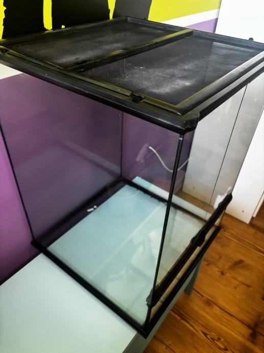 Prodam terarij dimenzij 46x46x62 (v cm). Na vrhu je mrežica, ki je snemljiva. Terarij je očiščen in razkužen. Po želji prodam še okrasno jamo (5e) in stiroporno podlago za notranjo stran zadnje stene (3e).