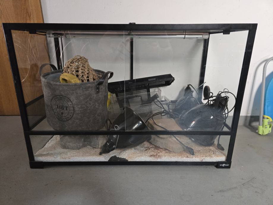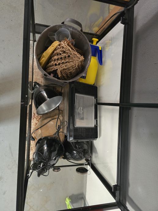 Prodam opremo bradato agamo. Terarij je dimenzije 90x60x45 cm. Oprema vsebuje s sijalke (UV A, B,grelna), plastični terarij za hrano, skale, viseča mreža, grelna podlaga(nerabljena)....