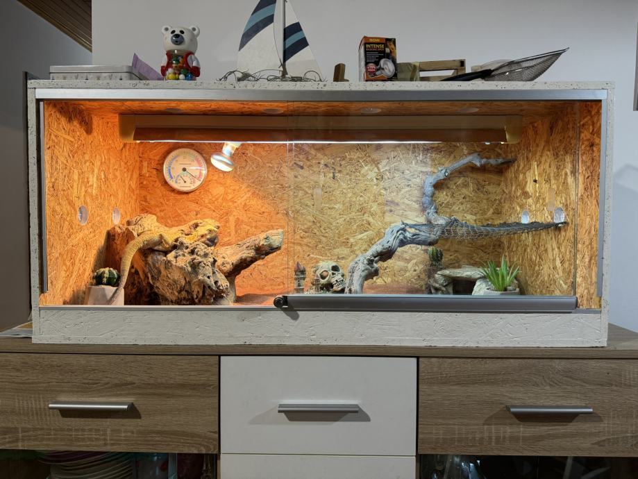Terarij je izdelan iz osb plosc, vratca so drsna izdelana po meri iz kaljenega stekla na ALU profilih. Zraven je tudi ključavnica za zaklepanje.