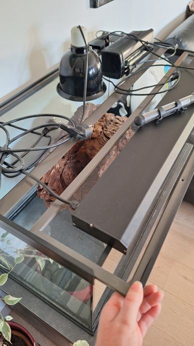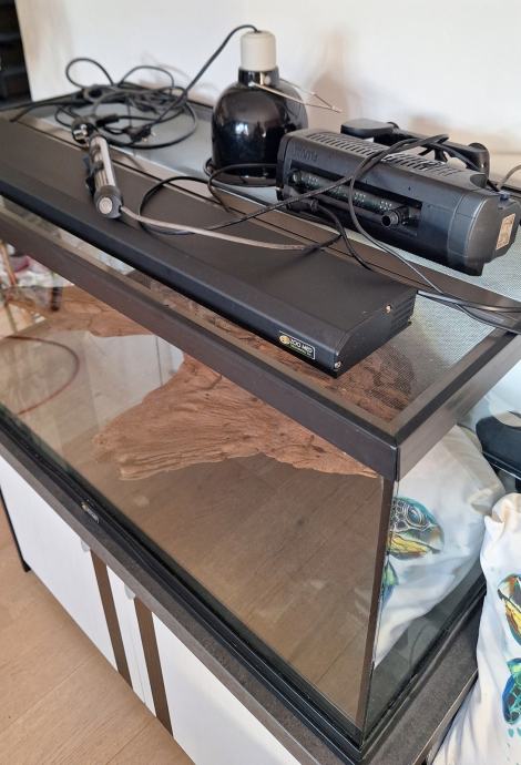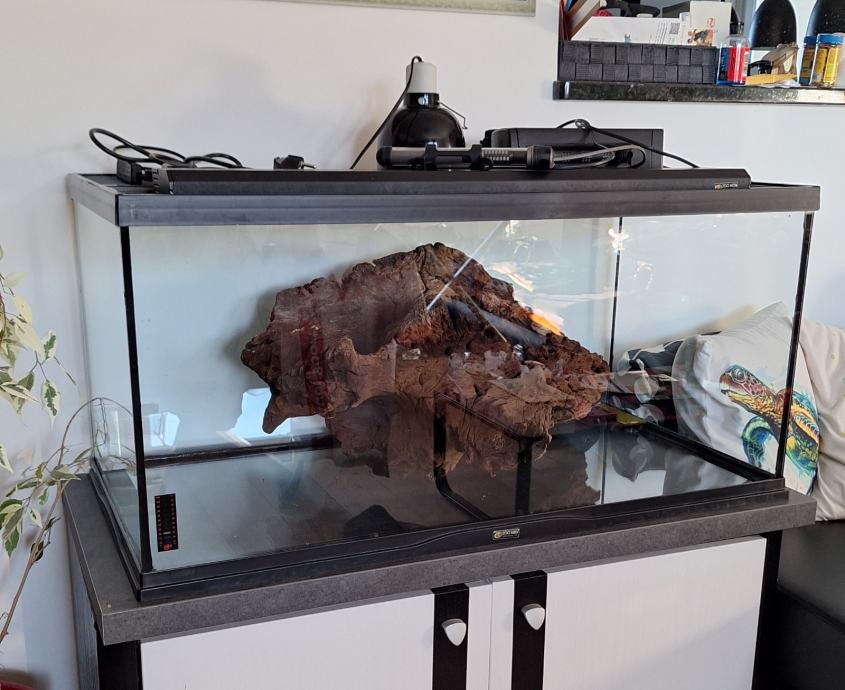 Prodam terarij ZooMed dimenzij 91x46x44cm z dvojnim mrežnim pokrovom, filtrom Fluval U3, nosilec + grelna žarnica odporna proti vodi (rabljena 2meseca), nosilec + UVB žarnica (rabljena 3mesece), grelec, večja korenina (služila kot kopno). Terarij je primeren za manjšo do srednje veliko vodno želvo. Terarij je kot nov brez prask, razpok ali poškodb.