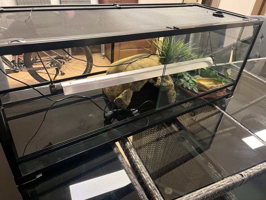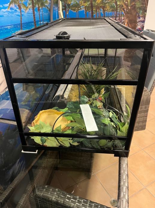 Terarij uporabljen eno leto, vsebuje celotno opremo za bivanje želv. Cena novega kompleta je bila 685€, prodamo za 440€. Možen prevzem na Ptuju.