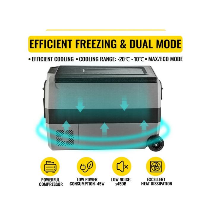 Kompresorski hladilnik z vgrajenim LED zaslonom, malo porabo električne energije in tihim delovanjem je popolna izbira za uživanje sveže hrane in hladnih pijač doma ali na potovanju. Primeren je za navtiko, karavaning in solarne sisteme. Ta vrhunski prenosni avtomobilski hladilnik je zaradi svoje izolacije primeren za uporabo tako v notranjih kot zunanjih prostorih.