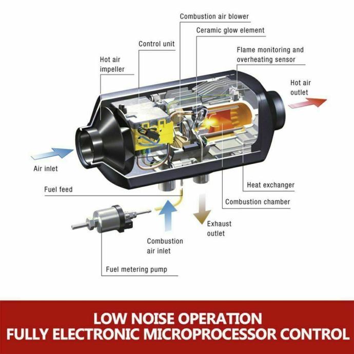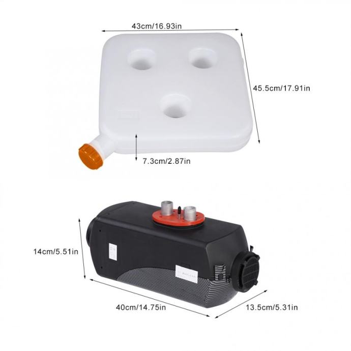 -Dimenzije (enake kot pri WEBASTO Airtop Eberspacher): Višina: 14cm , Dolžina 40cm, Širina 13,5cm