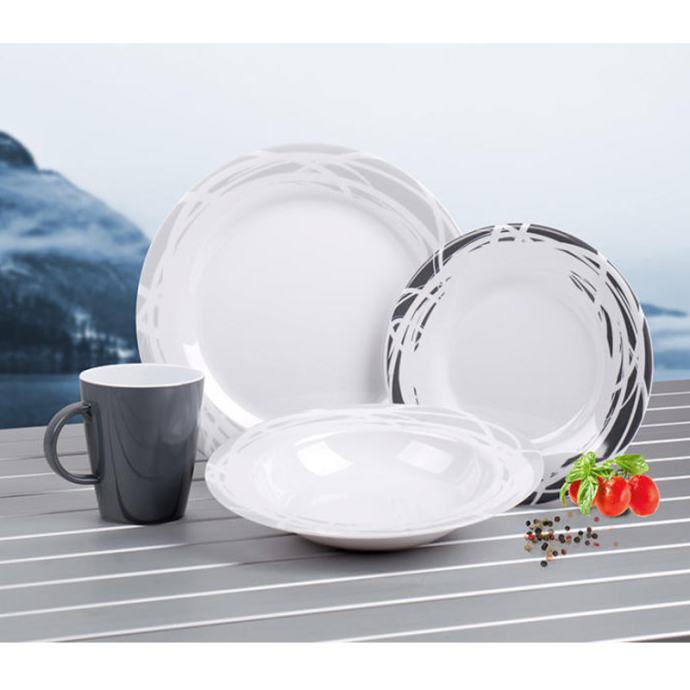Jedilni set Camp4 Copenhagen je trendi set, idealen za potovanja, piknike in domačo uporabo. Izdelan iz kvalitetnega melamina, brez škodljivega BPA-ja, ki je primeren za pomivanje v pomivalnem stroju. Uporaba mikrovalovne pečice ni priporočljiva! Krožnike odlikuje tudi protizdrsna podloga. Material: 100% melamin, 100% varen Komplet sestavljajo: - 4 krožniki (Ø 26,5 cm), - 4 desertni krožniki (Ø 16 cm), - 4 jušni krožniki (Ø 21,7 cm), - 4 skodelice z ročajem (0,3 l) Teža: 2,4 kg Opozorilo: Uporaba mikrovalne pečice ni priporočljiva!