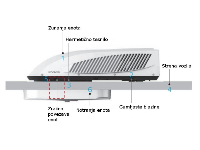 Strešne klime zagotavljajo udobje bivanja v prikolicah ali avtodomih. Ogrejejo ali ohladijo vozila dolžine do 10m tudi pri minimalni porabi in minimalnem zagonskem toku. Napajajo se preko priključka 220-240V. Enoto je možno upravljati preko Wi-Fi povezave, z daljinskim upravljalnikom ali ročno.