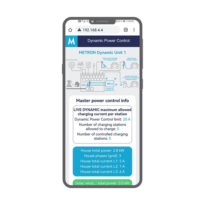 Metronovo brezžično dinamično enoto za polnjenje električnih vozil (3FD-3). Le-ta zagotavlja zaščito glavnih hišnih varovalk, dodajanje energije iz sončne elektrarne za povečanje moči/hitrosti polnjenja in “zeleno” polnjenje s presežki sončne energije. Cena: 195€ + DDV (en modul je lahko za več postaj)