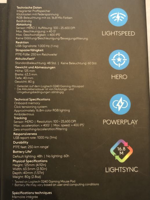 Nikoli uporabljena brezžična gaming miška, s priloženim USB kablom za polnjenje ter opcijskimi stranskimi tipkami (2 za na levo in 2 za na desno stran miške).