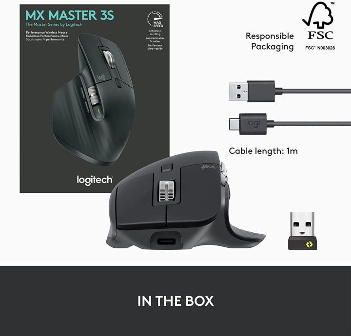 Logitech MX Master 3S. Faktor oblike: desno. Tehnologija zaznavanja gibanja: Optična, Vmesnik naprave: RF brezžična + Bluetooth, Ločljivost gibanja: 8000 DPI, Vrsta gumbov: Pritisnjeni gumbi, Število gumbov: 7, Vrsta pomika: Kolo Vir napajanja: Baterije. Barva izdelka: Grafit