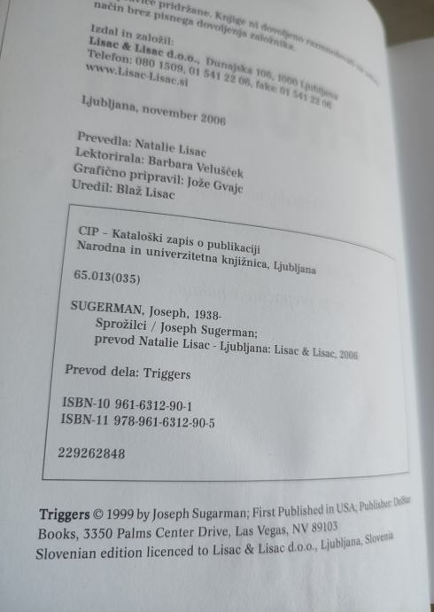 Sprožilci - Joseph Sugarman. 30 prodajnih orodij, s katerimi lahko nadzorujete misli vaše stranke, jo motivirate, vplivate nanjo in jo prepričate v nakup. Trda vezava. Lisac & Lisac 2006. Ni nova. Cena je 8 € + ptt.