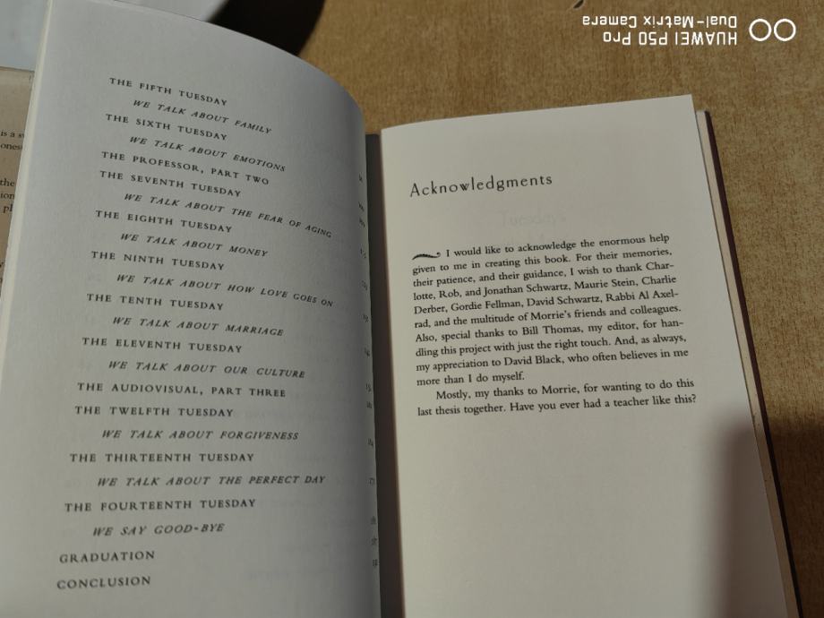 Mitch Albom je imel to drugo priložnost. Ponovno je odkril Morrieja v zadnjih mesecih njegovega življenja. Ker je vedela, da umira, je Morrie vsak torek obiskala Mitcha v njegovi delovni sobi, tako kot sta včasih na kolidžu. Njuno ponovno vzpostavljeno razmerje se je spremenilo v eno zadnjo »predajo«: lekcije o tem, kako živeti. "Resnica je, Mitch," je rekel, "ko se enkrat naučiš umreti, se naučiš živeti."