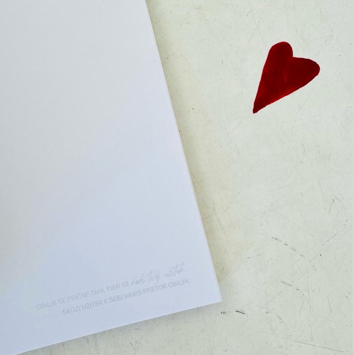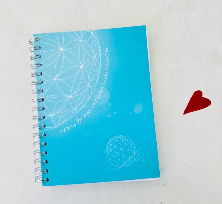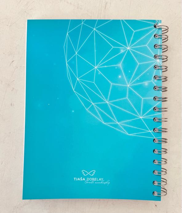 Brezčrtni zvezek je velikosti A5. Vsak list v zvezku je matrica, ki ima na strani napisano afirmacijo. Nekaj sem jih priložila na sliki. Kreatorka zvezka je Tjaša Dorelay. Zvezek nosi naslov Tvoja vibracija ustvarja tvojo situacijo. Debelina zvezka 2 cm, povezan v kovinsko špiralo.