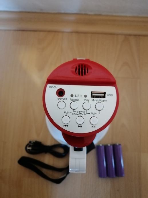 Prodam nov nikoli rabljen prenosni megafon s sireno in predvajalnikom/snemalnikom glazbe,USB zvocnik z nadzorom glasnosti,primers za zabave,dogodke,turneje.zraven je kabel za polnjenje+3 litijeve baterije 35w,d24.5cm s15cm