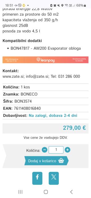 Vlažilnik je KOT NOV uporabljen samo 5x. Cena novega 250€. Prevzem Grosuplje-Ljubljana