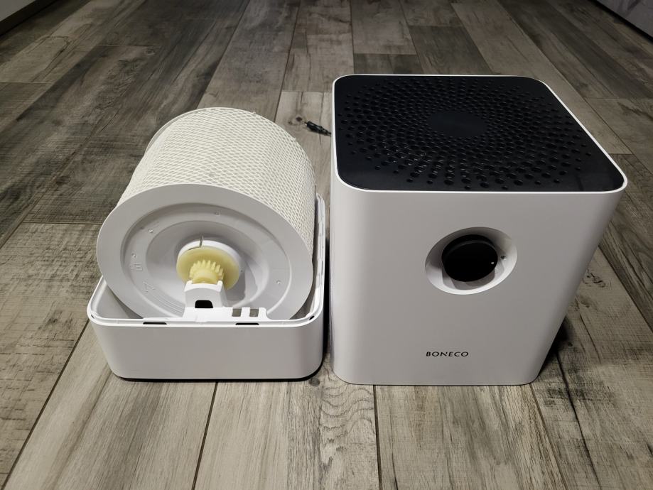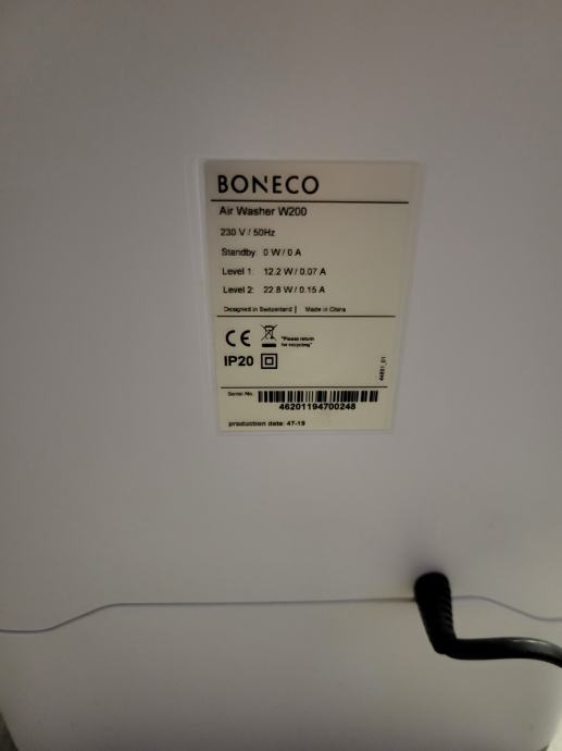 Vlažilnik in pralnik zraka BONECO W200. V napravi je vgrajen alarm za prikaz prazne posode vode, stikalo za vklop in dves topni delovanja, ISS paličica in predal za eterična olja. Posebni valj v napravi se vrtijo skozi vodo in na naraven način čistijo (prah, pršice, delci dima) ter navlažijo zrak, kot to naredi v naravi dež.