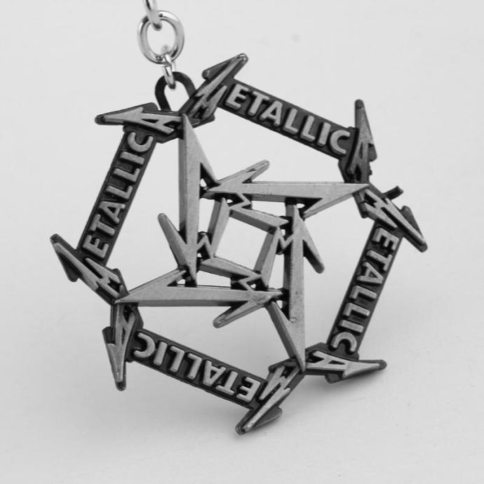 Masivni obesek za ključe skupine Metallica v srebrni barvi.