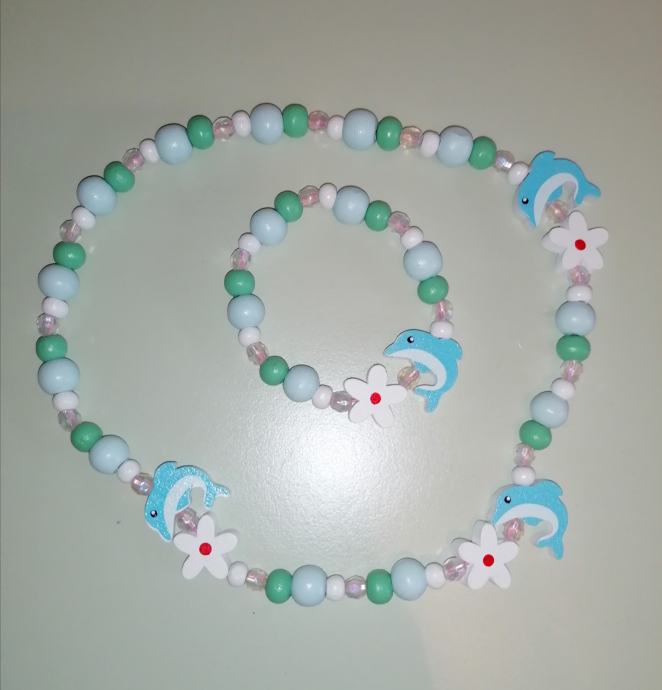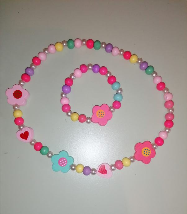 Verižica&zapestnica za deklico. Material: les in plastika. Cena 2,5€ za komplet (verižica in zapestnica). Pošljem tudi po pošti.