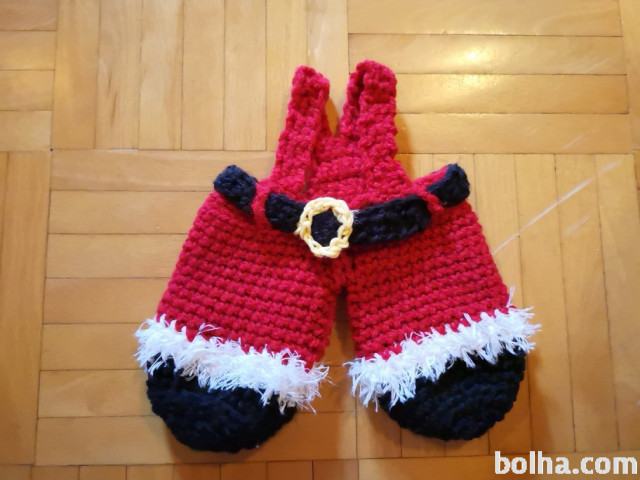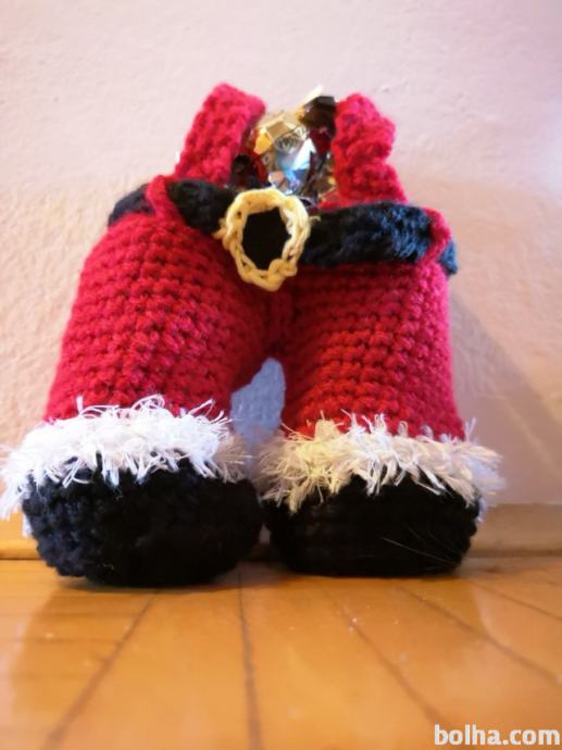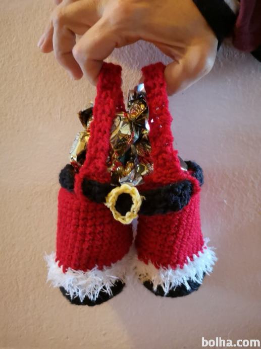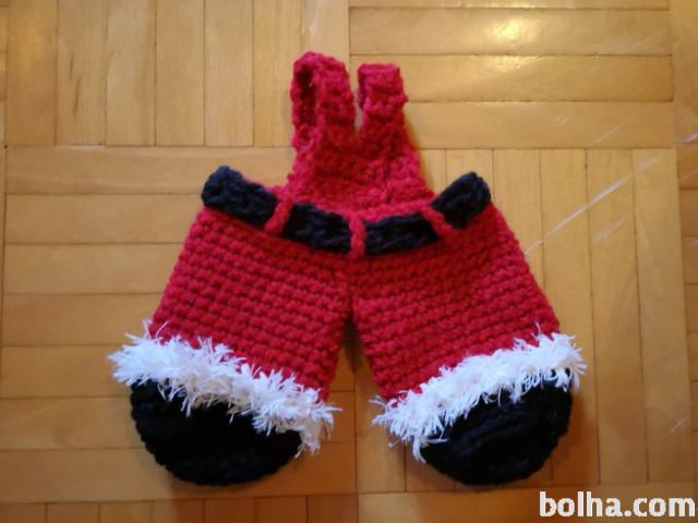 Ročno izdelane božičkove hlačke, primerne za majhna darilca v božičnem času. Kvačkane, velikost prbl. 15x15 cm.