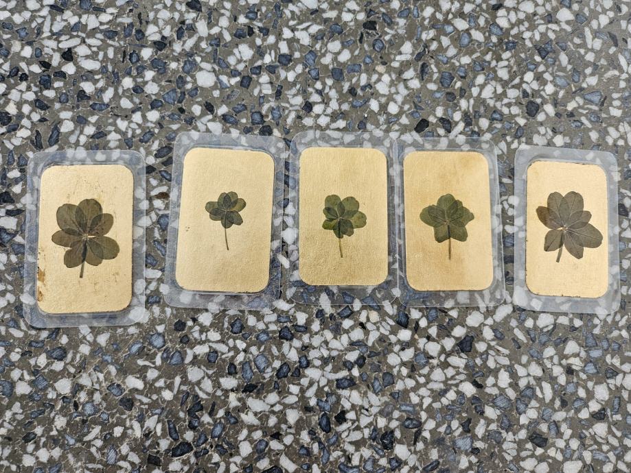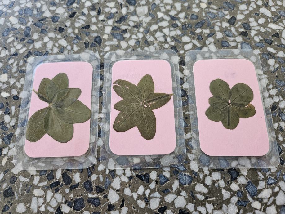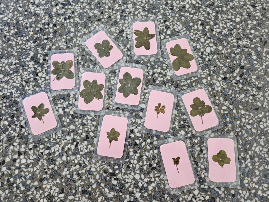 Prodam prave (sem jih sam osebno našel), posušene in prešane, plastificirane v velikosti bančnih kartic. Za srečo, super za darilo. 5 peresnih imam na voljo 100, 12 6peresnih in 5 7peresnih.