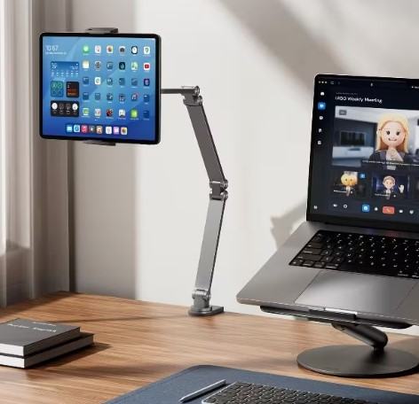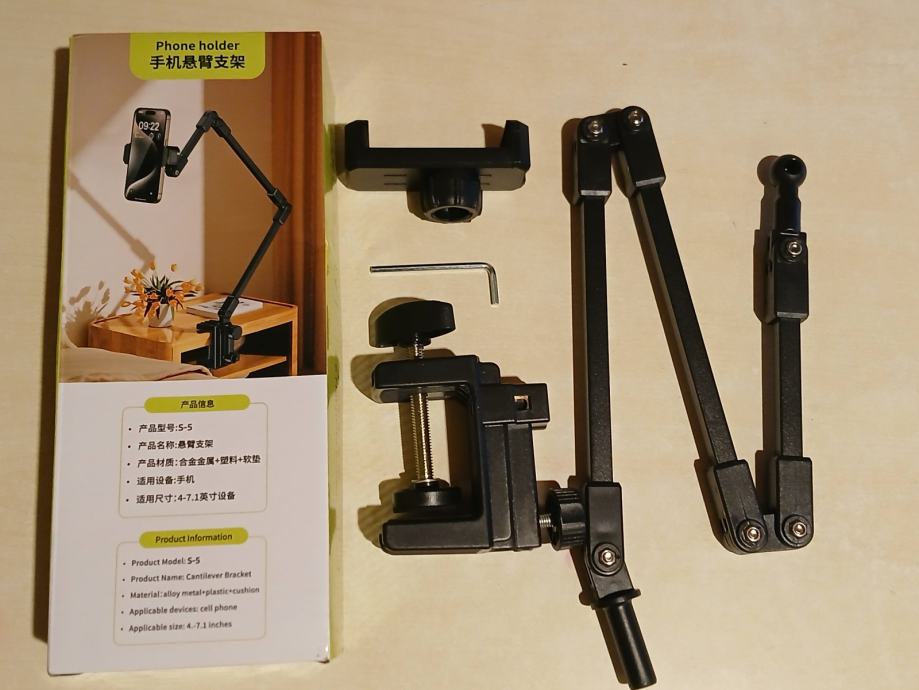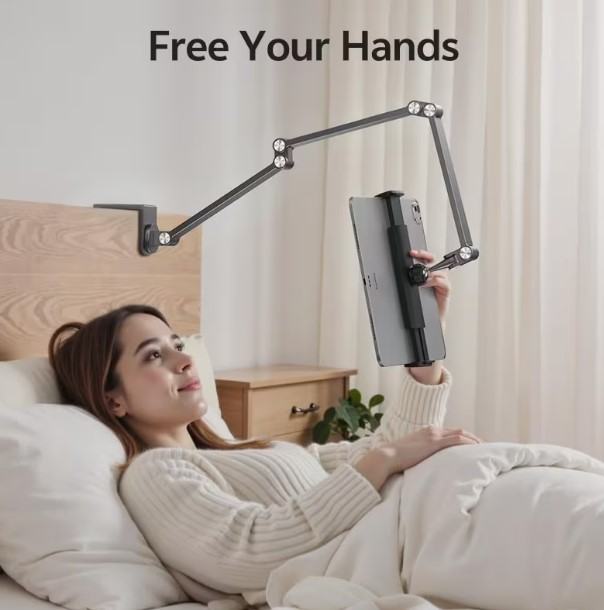 Kompaktno, železno držalo za telefon. Lahko se pripne na rob postelje, mizo, ima 360° obračanje.
