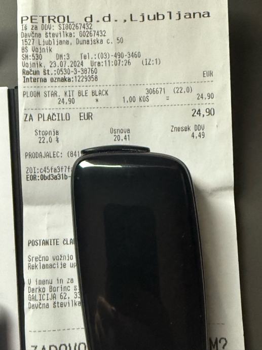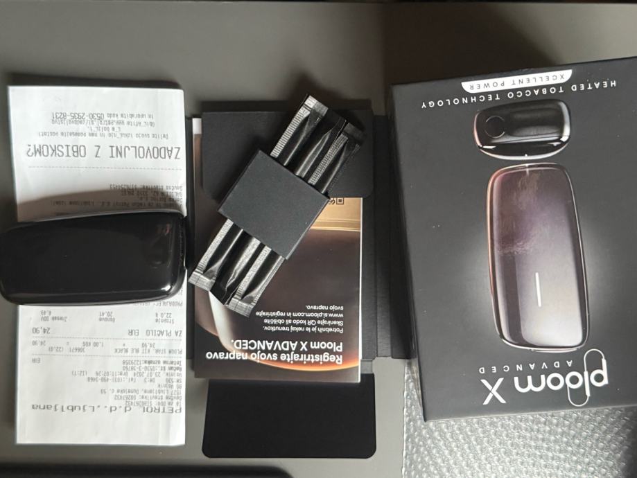 Nova, samo sprobana Ploom X naprava za segrevanje tobaka v originalni škatli, vključno s čistilnimi palčkami, polnilnim kablom in računom. Naprava je bila kupljena julija 2024