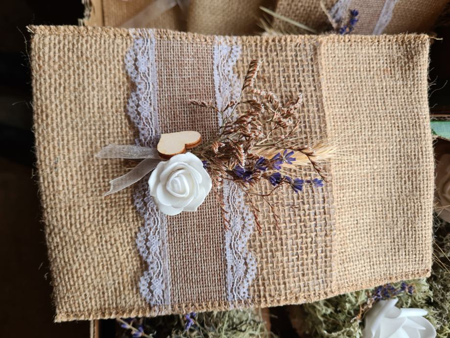 Prodam ročno izdelane pogrinjke z motivom sivke in žaklovine za poroko - cca 60 kom.