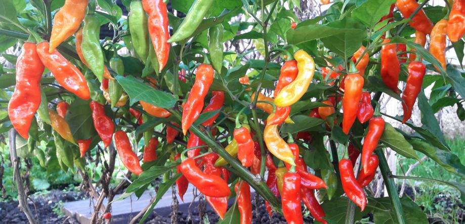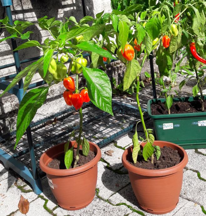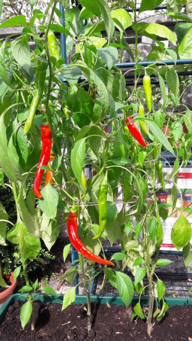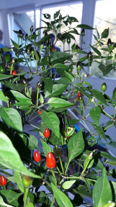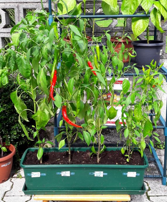 Na voljo imam še 9 čili dreveščkov v loncih in eno korito. Visoki so med 70 cm - 130 cm, cvetijo in imajo že zrele plodove. So ekološki, zdravi, moji domači! Nekateri lahko tudi prezimijo. Nizko do bolj pekoče vrste: Penis, Lucifer, Toskana, Habanero, Bhut Jolokia, Moruga... Čili mini mini je idealen tudi kot darilo za kuharje.
