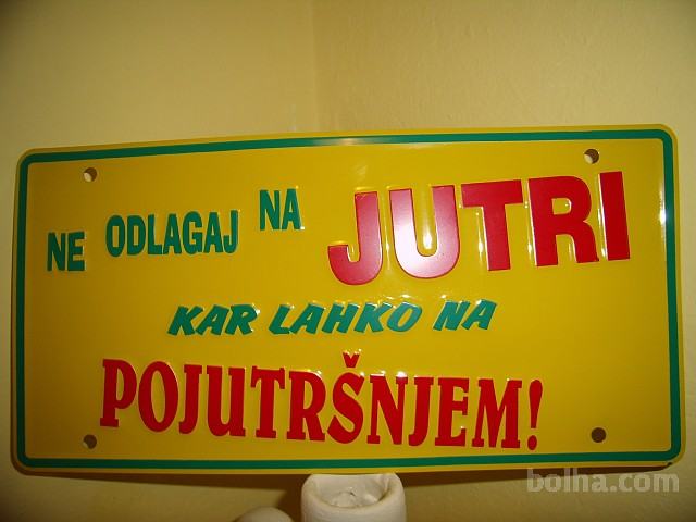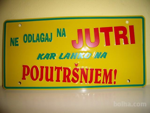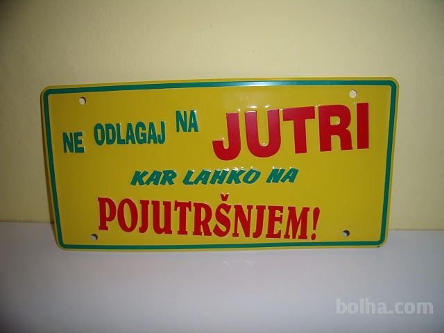 Nova kovinska tablica z napisom NE ODLAGAJ NA JUTRI KAR LAHKO NA POJUTRŠNJEM! S štirimi luknjami za pričvrstitev s premerom 6 mm. Velikost tablice 32 x 16 cm.
