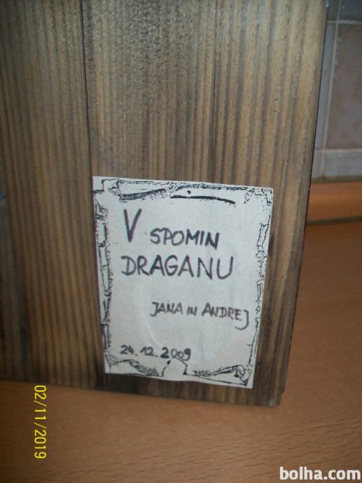Kot je razvidno iz priloženih slik, je darilna škatla narejena iz lesa in stekla ter prelepo okrašena. Darilo je bilo pakirano leta 2009 (razvidno iz priložene slike), tako da je tudi Merlot v škatli star vsaj toliko, če ne celo več. Steklenica je 0,33 litra. Škatlo imamo lahko obešeno na steni, lahko pa jo enostavno položimo kam na omaro. Toplo priporočam.