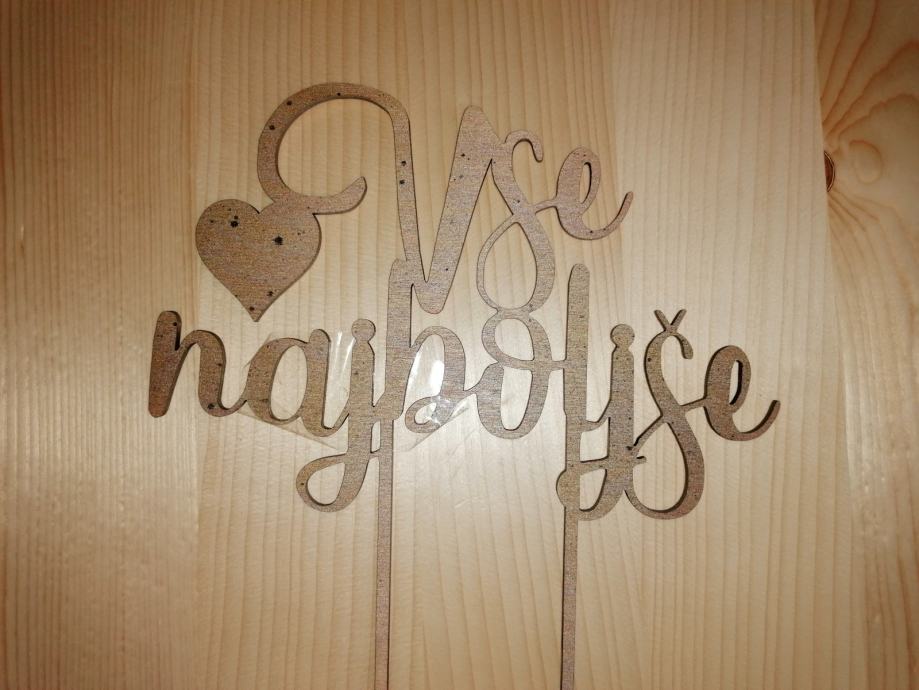 Prekrasen zlat ali srebren TOPPER za okrasitev torte z napisom Vse najboljše, izdelan iz bukev 4mm vezane plošče.