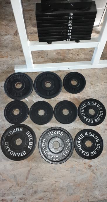 Uteži za olimpijske palice različnih proizvajalcev. Premer luknje v sredini je 50 milimetrov. Cena uteži je 3,7 EUR/kilo. Uteži, ki so še na voljo: