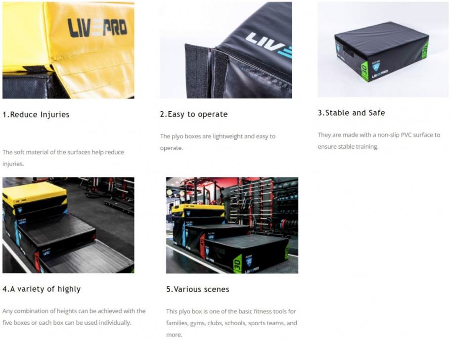 Trdna, vzdržljiva doskočna površina, ki rešuje problem športnikov v strahu pred poškodbami med skokom. Zaboji so dovolj trdni za izvajanje pliometričnih gibov, a hkrati dovolj mehki za prijetno vadbo. Skačemo lahko na posamezne zaboje ali kombiniramo različne višine, tako da škatle zložimo eno na drugo.Možnost čiščenja z vlažno krpo
