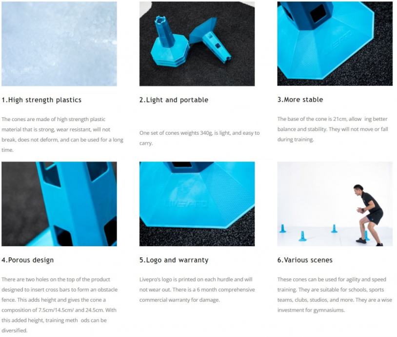 Visoki vadbeni stožci za treniranje agilnosti, koordinacije in hitrosti. Stožec je izdelan iz mehkih, visoko trdnih in trpežnih materialov. Ti materiali se ne zlomijo, tudi če nanje stopite, in ne poškodujejo športnikov. Ima široko 20 cm površino, ki omogoča boljše ravnotežje in stabilnost. Agility stožec je nepogrešljiv pripomoček za poligone in športne treninge.