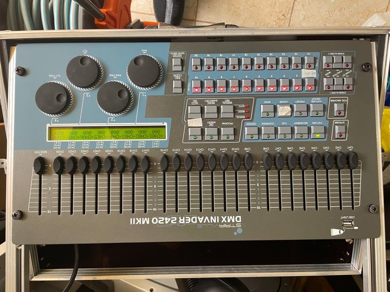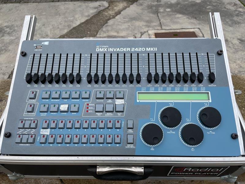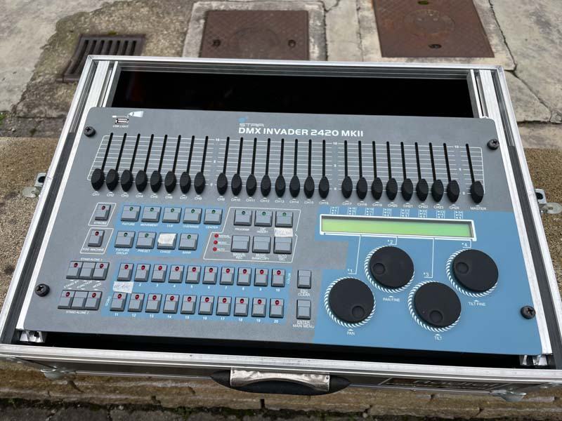 Prodam mešalno mizo za luči Stairville DMX Invader 2420 MK II. Miza je nerabljena in v kovčku (cena kovčka je 105 evrov in je v ceni spodaj), brez prask ali kakšnih koli poškod. Deluje brezhibno. Cena nove je 555 evrov. https://www.thomann.de/intl/si/stairville_dmx_invader_2420_mk_ii.htm. Zraven imam še originalna navodila.