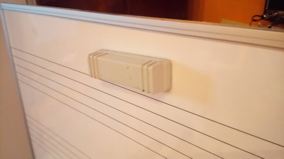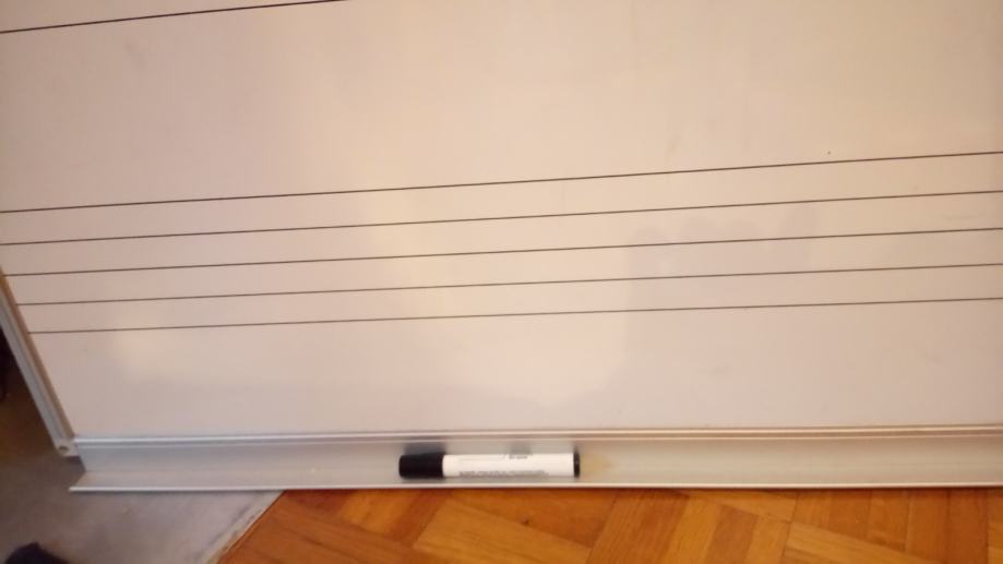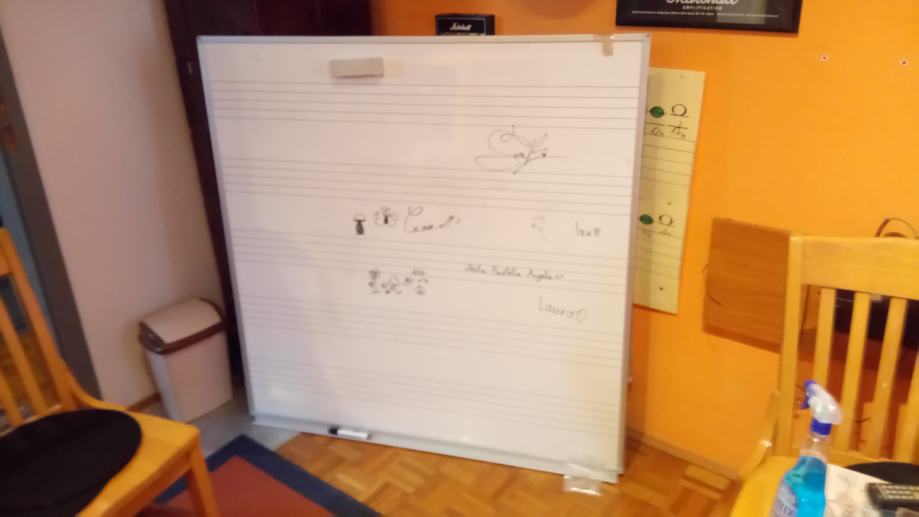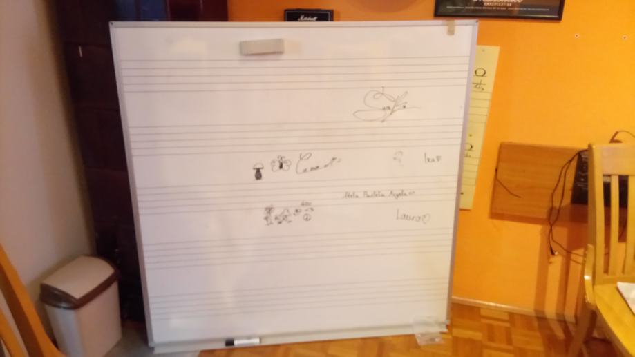 Prodam učno tablo z notnim črtovjem za učilnico, dimenzije 122 cm x124 cm, magnetna, za white board flomaster, nosilno aluminijasto obrobo, luknje na vogalih za privijačenje, dodam še magnetni brisalec za flomaster z setom gobic... Tabla je kot nova, brez prask.