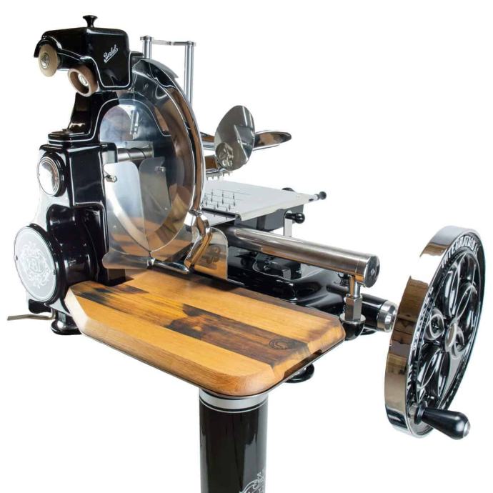 Rezalnik mesa B114 z vztrajnikom je stroj primeren tudi za intenzivno uporabo in za vse vrste suhomesnatih izdelkov, zlasti za najboljši pršut.