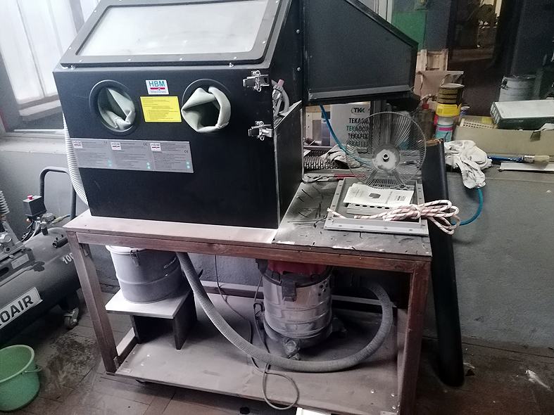 Prodam komoro za peskanje s kompresorjem in priročnim sesalcem. Velikost 110l, notranje mere 68X45x43/25. Komora je dodatno obložena z gumo za daljšo življenjsko dobo, manometrom, na leseni mizi s kolesi.
