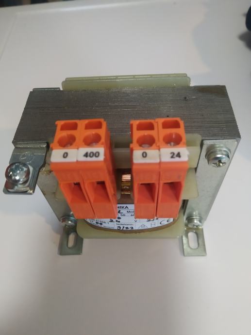 Trafo je nerabljen, primarna napetost je 400 v ( lahko ga priklopite na dve fazi) sekundar izhod pa je 24 v, moči cca 50 watov, tok sek je 2,1 A. Tip transformatorja je EI dimenzije cca