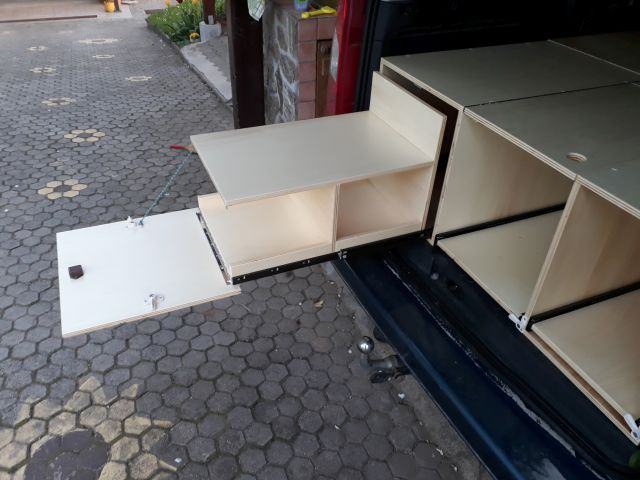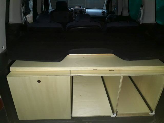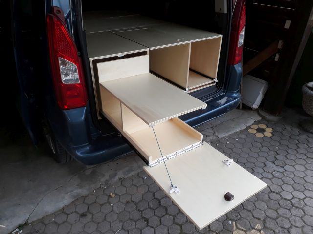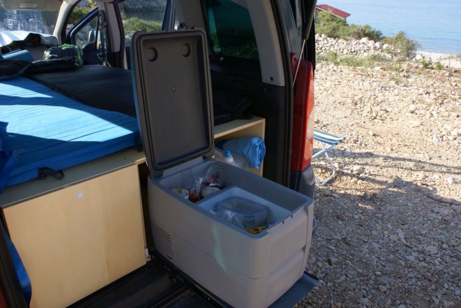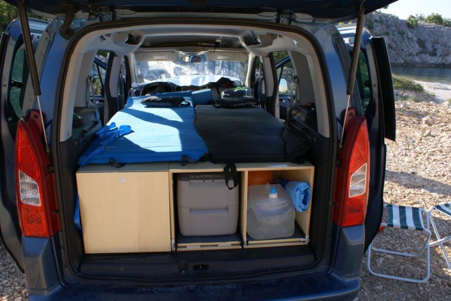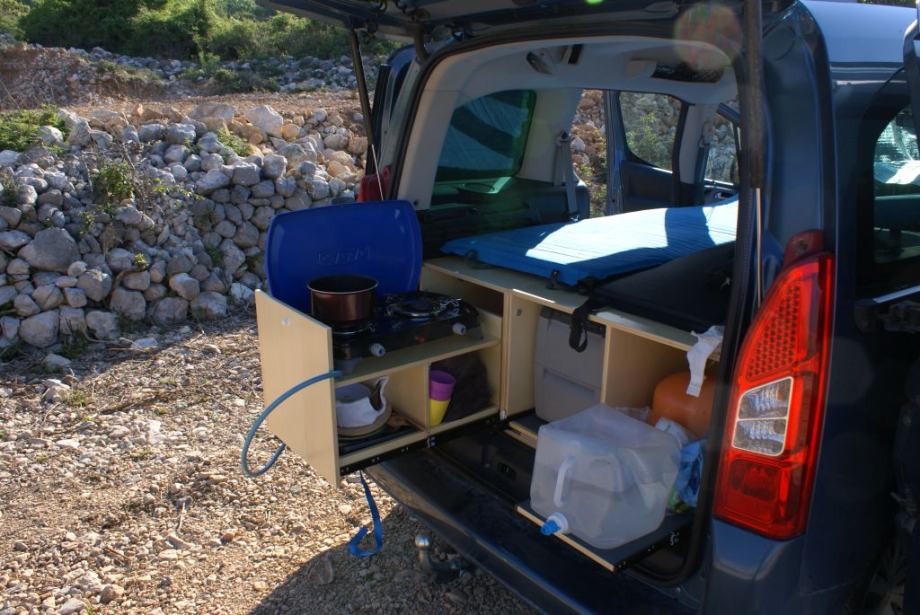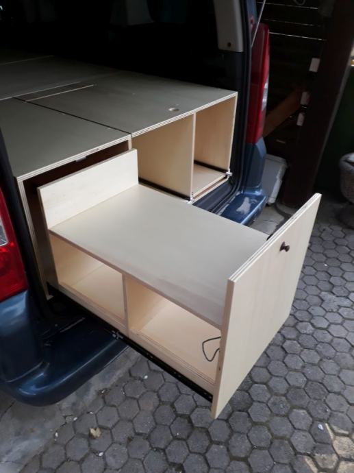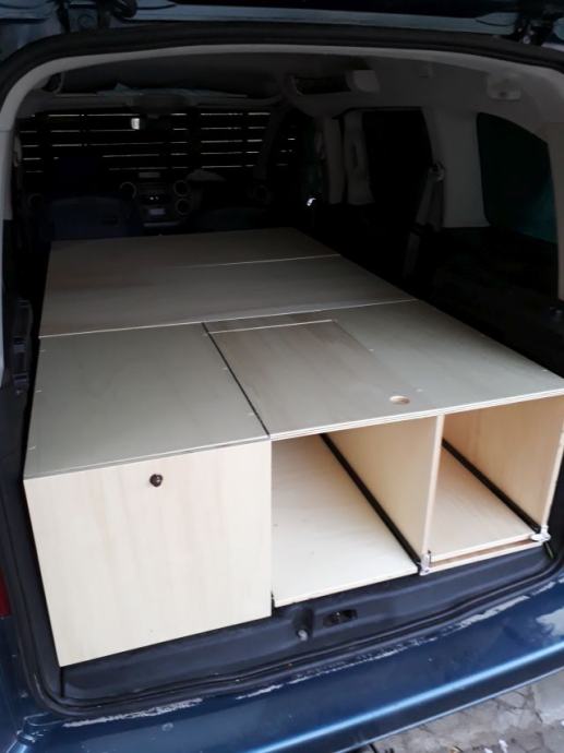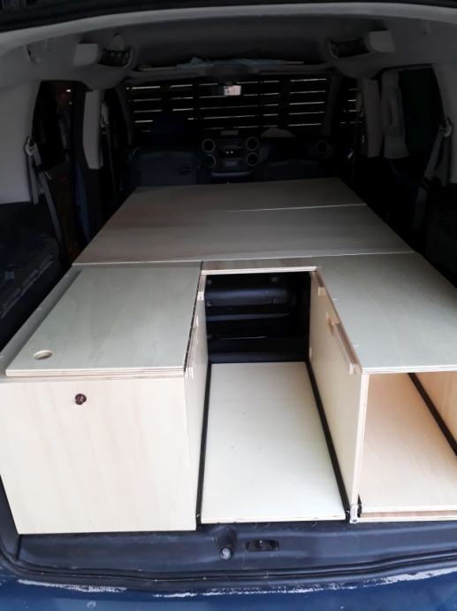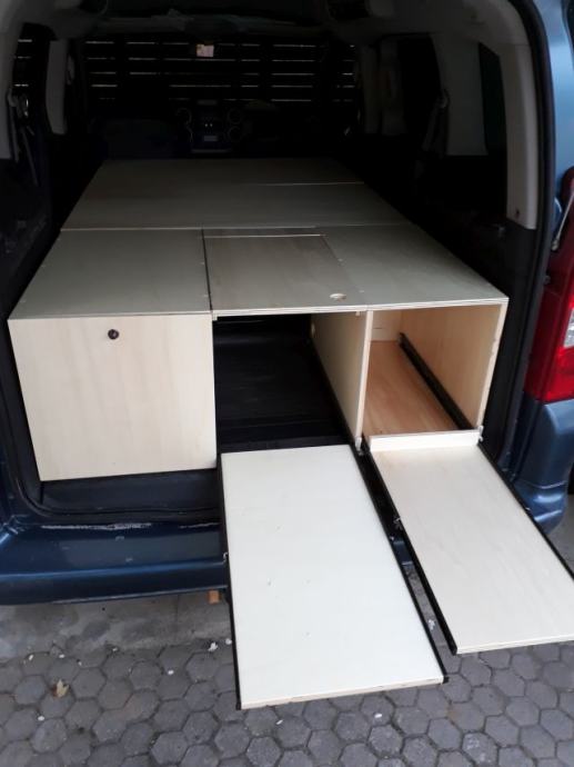 Prodajamo camping boxe, ki v nekaj minutah spremenijo vaše vozilo v mini avtodom. Izdelani so iz 15mm ultralahke vezane plošče. V osnovnem sestavu sta dva boxa, ki se sestavita v tri prekate. Vsi prekati imajo izvlečne police na kvalitetnih vodilih. En prekat je namenjen kuhinji, drugi hladilniku in tretji za vodo in ostalo drobnarijo. V sestavu sta še dve deski z ogrodjem s katerimi se v manj kot minuti postavi postelja dolžine 200cm. Pri postavitvi postelje se podrejo samo nasloni zadnjih sedežev.