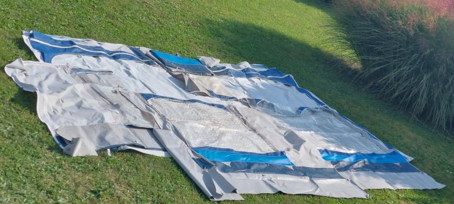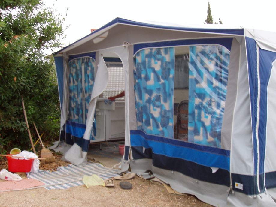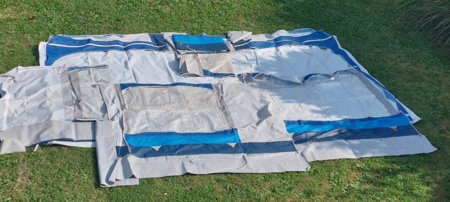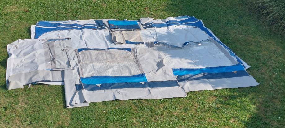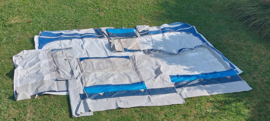 Celoletni baldahin, predprostor za počitniško prikolico, modro beli, lepo ohranjen, očuvan, kompleten dolžine 5m, obok 8m do talnih zaščitnih plastik! Vse stranice se lahko odprejo ali odstranijo ! Nepoškodovan ! Komplet palic!