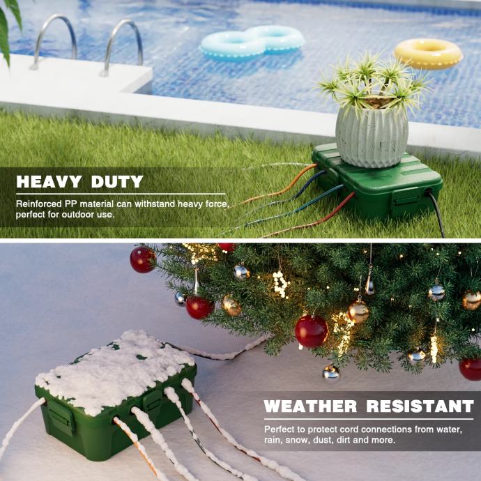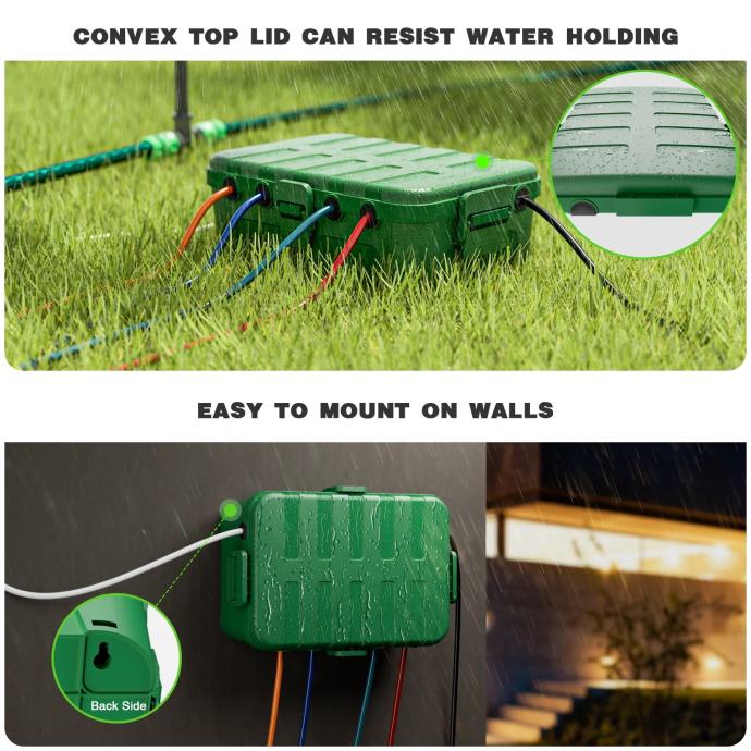 Izdelan iz močnega ojačanega PP materiala, ki vzdrži težke vremenske razmere in zaščiti zunanje povezave pred električnimi nevarnostmi