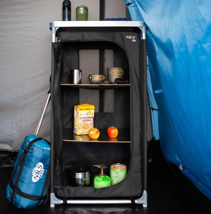 Ogrodje omarice za šotor je izdelano iz aluminijastih cevi s premerom 19 milimetrov, ki so povezane s plastičnimi konektorji. Spodnji konektorji so opremljeni z izboklinami, zaradi katerih okvir ne leži na podstavku, kar odpravlja potrebo po iskanju ravnine in omarica je stabilna tudi na neravnih površinah. Platno omarice je iz poliestra z obdelavo Oxford 600D. Ta tkanina je zelo odporna na poškodbe in vremenske vplive. V omarico se nato namestijo 3 police iz MDF plošče. Sprednja vrata so izdelana iz mrežice za kroženje zraka, lahko se zvijejo do roba in pritrdijo s trakovi ali pa se zaprejo z dvojno zadrgo. Zadnji del omarice je opremljen z neodstranljivo mrežico. Po uporabi lahko omarico pospravite v priloženo transportno torbo z ročajem.